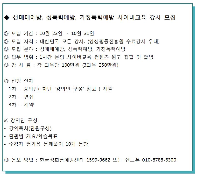 성매매예방, 성폭력예방, 가정폭력예방 사이버교육 강사 모집
