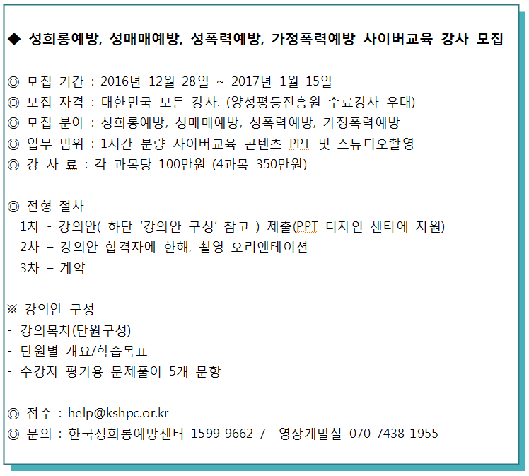◆ 성희롱예방, 성매매예방, 성폭력예방, 가정폭력예방 사이버교육 강사 모집