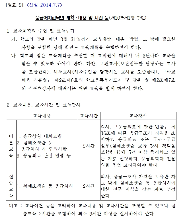 [ 학교보건법 시행규칙 ] 응급처치심폐소생술 교육내용 및 시간 배정