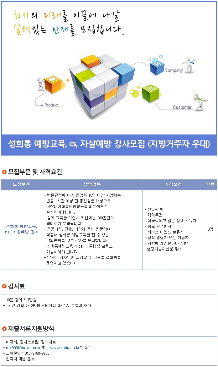 성희롱예방교육, 서비스교육(CS), 전문강사 모집 (지방거주자 환영)